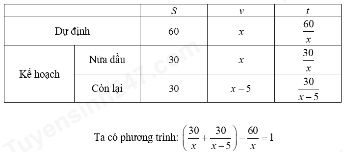 Quãng đường AB dài \(60km\). Một người đi xe đạp từ A đến B với vận tốc và thời gian dự định. Sau khi đi được nửa quãng đường, người đó giảm vận tốc \(5km/h\) nên đã đến B chậm \(1h\) so với dự định. Tính vận tốc dự định của người đó.