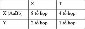 Ở một loài thực vật, xét 2 cặp tính trạng tương phản do 2 cặp gen nằm trên 2 cặp nhiễm sắc thể thường quy định, trong đó alen A quy định thân cao là trội hoàn toàn so với alen a quy định thân thấp; alen B quy định hoa tím là trội hoàn toàn so với alen b quy định hoa trắng. Cho 2 cây X và Y lần lượt thụ phấn cho cây cây Z và T thu được thế hệ F1. Tổng số kiểu tổ hợp giao tử sinh ra từ các phép lai là 15. Biết rằng tổng số kiểu tổ hợp giao tử sinh ra từ phép lai giữa cây X với 2 cây Z, T gấp 4 lần tổng số kiểu tổ hợp giao tử sinh ra từ phép lai giữa cây Y với 2 cây Z, T và số loại giao tử của cây Z nhiều hơn số loại giao tử từ cây T. Tính theo lý thuyết, trong số các phát biểu sau, có bao nhiêu phát biểu đúng?
