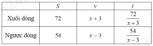 Một tàu thủy chạy xuôi dòng một khúc sông dài \(72km\) sau đó chạy ngược dòng khúc sông ấy \(54km\) hết tất cả \(6\) giờ. Tính vận tốc riêng của tàu thủy biết vận tốc dòng nước là \(3km/h\).