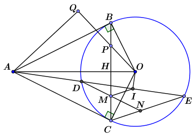 Cho đường tròn tâm \(O\) bán kính \(R\). Từ một điểm \(A\) nằm ngoài \(\left( O \right)\) kẻ hai tiếp tuyến \(AB;AC\) và cát tuyến \(ADE\) tới đường tròn tâm \(O\). Gọi \(I\) là trung điểm của \(DE\). \(AO\) cắt \(BC\) tại \(H\). Chứng minh rằng :