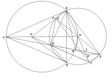 4) Tia \(CD\) cắt \(AO\) tại điểm \(P\), tia \(EO\) cắt \(BP\) tại điểm \(F\). Chứng minh tứ giác \(BECF\) là hình chữ nhật.