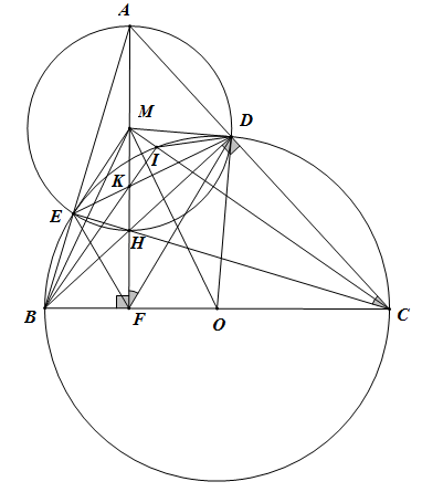 c) Gọi \(K\) là giao điểm của \(AH\) và \(DE\). Chứng minh \(M{D^2} = {\rm{ }}MK.MF\) và \(K\) là trực tâm của \(\Delta MBC\)