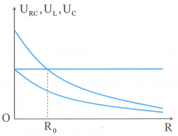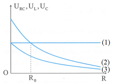 Đặt điện áp xoay chiều có giá trị hiệu dụng và tần số không đổi vào hai đầu đoạn mạch AB theo thứ tự gồm cuộn cảm thuần L, biến trở R và tụ điện C mắc nối tiếp. Gọi \({U_{RC}}\) là điện áp hiệu dụng ở hai đầu đoạn mạch gồm tụ C và biến trở R, \({U_C}\) là điện áp hiệu dụng ở hai đầu tụ C, \({U_L}\) là điện áp hiệu dụng hai đầu cuộn cảm thuần L. Hình bên là đồ thị biểu diễn sự phụ thuộc của \({U_{RC}},\,\,{U_L},\,\,{U_C}\) theo giá trị của biến trở R. Khi \(R = 2{R_0}\) thì hệ số công suất của đoạn mạch AB gần nhất với giá trị nào sau đây?