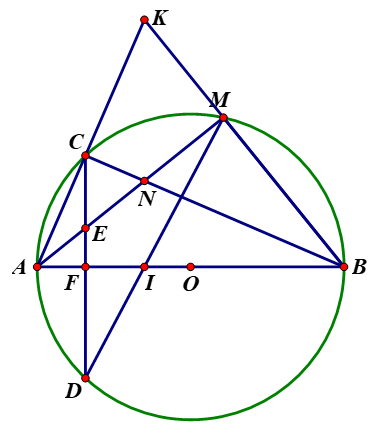 Cho đường tròn tâm \(O\) đường kính \(AB\) và dây \(AB\) vuông góc với \(AB\) tại điểm \(F\) . Trên cung nhỏ \(BC\) lấy điểm \(M\) (\(M\) không trùng với \(B\) và \(C\) ), đường thẳng \(AM\) cắt đường thẳng \(CD\) tại \(E\) .