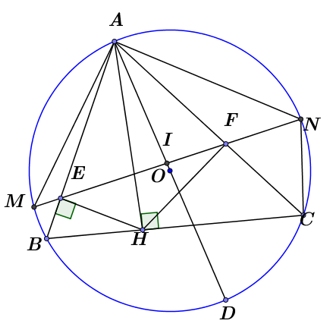 2) Đường thẳng \(EF\) cắt đường tròn \(\left( O \right)\) tại hai điểm \(M,N\)\((M\) thuộc cung nhỏ \(AB)\). Chứng minh số đo cung \(ABC = \)số đo cung \({\rm{AF}}M\) và \(AH = AN.\)