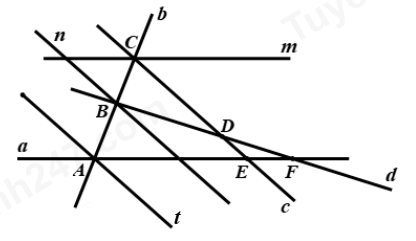 a) Có bao nhiêu đường thẳng trên hình vẽ? Liệt kê các góc tạo bởi đường thẳng \(a\) và đường thẳng \(c\).