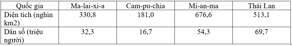 Cho bảng số liệu:DIỆN TÍCH VÀ DÂN SỐ CỦA MỘT SỐ QUỐC GIA NĂM 2019(Nguồn: Thống kế từ