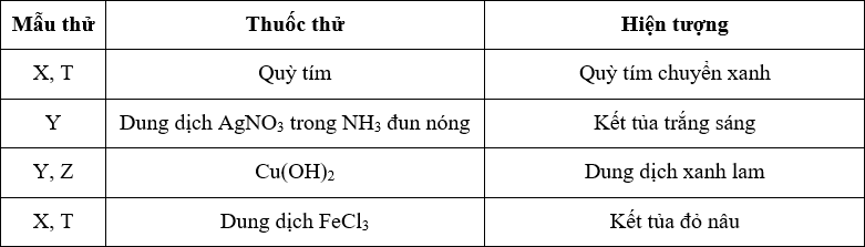 Kết quả thí nghiệm của các dung dịch X, Y, Z, T với thuốc thử được ghi ở bảng sau:Các chất