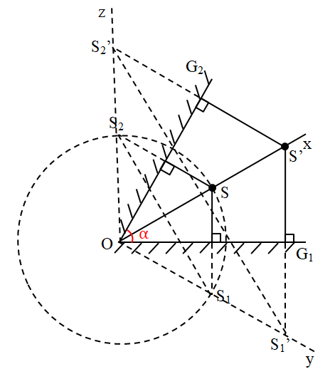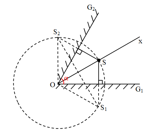 Hai gương phẳng \({G_1},\,\,{G_2}\) hợp với nhau một góc \(\alpha = {30^0}\). Một điểm sáng S nằm trên đường phân giác Ox của hai gương, cách cạnh chung O một khoảng R = 5cm. Tính:
