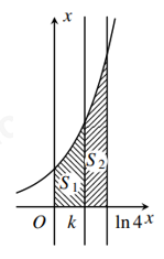 Cho hình thang cong \(\left( H \right)\) giới hạn bởi các đường \(y = {e^x},\,\,y = 0,\,\,x = 0,\,\,x = \ln 4\). Đường thẳng \(x = k\,\,\left( {0 < k < \ln 4} \right)\) chia \(\left( H \right)\) thành hai phần có diện tích là \({S_1}\) và \({S_2}\) như hình vẽ bên. Tìm \(k\) để \({S_1} = 2{S_2}\).