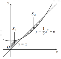Cho đường thẳng \(y = x\) và parabol \(y = \dfrac{1}{2}{x^2} + a\) (\(a\) là tham số thực dương). Gọi \({S_1}\) và \({S_2}\) lần lượt là diện tích của hai hình phẳng được gạch chéo trong hình vẽ bên. Khi \({S_1} = {S_2}\) thì \(a\) thuộc khoảng nào dưới đây?