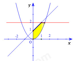 Cho hình phẳng D được giới hạn bởi các đường \(x = 0,\,y = 2,\,y = x + 1\) và \(y = {x^2}\) như hình vẽ (phần màu vàng)