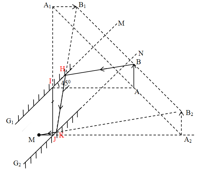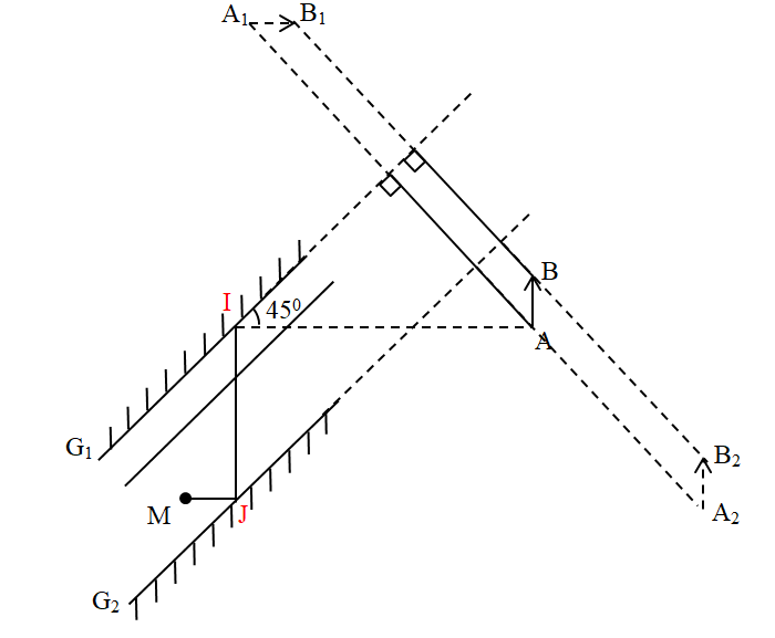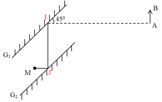 Một kính tiềm vọng gồm hai gương phẳng \({G_1}\) và \({G_2}\) song song, quay mặt phản xạ vào nhau, nghiêng một góc \({45^0}\) so với phương ngang. Các tia sáng đi từ vật sáng AB qua \({G_1},\,\,{G_2}\) tới mắt quan sát viên tại M. Cho AB = 3m, AI = 48m, IJ = 1,8m, JM = 0,2m.
