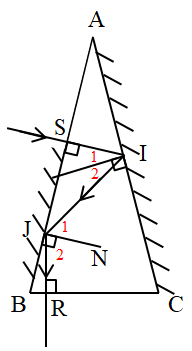Một khối thủy tinh hình lăng trụ, tiết diện có dạng tam giác cân ABC. Người ta mạ bạc toàn bộ mặt AC và phần dưới mặt AB (hình vẽ). Một tia sáng rọi vuông góc với mặt AB, sau 2 lần phản xạ liên tiếp trên các mặt AC, AB thì tia ló ra vuông góc với BC. Xác định góc A của khối thủy tinh.