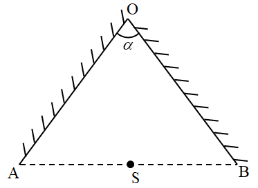 Hai gương phẳng quay mặt phản xạ vào nhau và hợp với nhau góc \(\alpha \). Tiết diện vuông góc với cạnh chung là một tam giác cân AOB. Điểm sáng S được đặt ở trung điểm của AB. Xác định \(\alpha \) để mọi tia sáng từ S chỉ phản xạ một lần ra khỏi tam giác AOB.