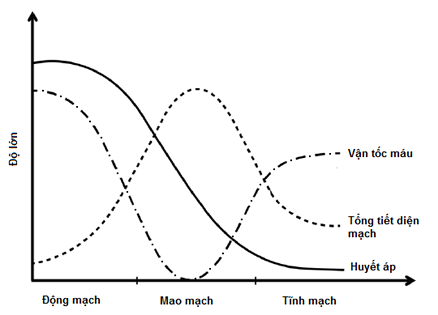 Vận tốc trong hệ mạch giảm theo chiều động mạch → tĩnh mạch → mao mạch (vì tổng tiết diện của mao mạch lớn hơn rất nhiều so với tổng tiết diện của động và tĩnh mạch)