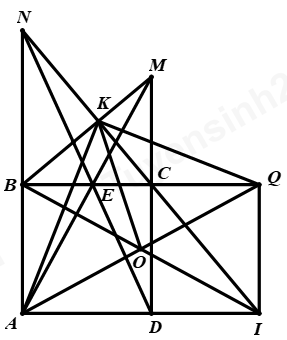 Cho hình vuông \(ABCD\),\(E \in BC\), tia \(AE\) cắt \(DC\) tại \(M\), tia \(DE\) cắt \(AB\) tại \(N\), tia \(BM\) cắt \(CN\) tại \(K\), tia \(NC\) cắt \(AD\) tại \(I\).
