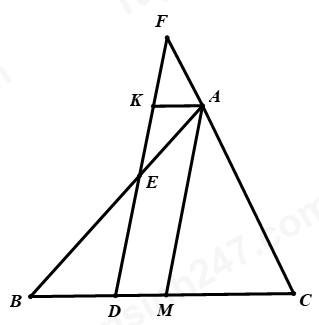 Cho \(\Delta ABC\), trung tuyến \(AM\). Qua điểm \(D\) thuộc cạnh \(BC\), vẽ đường thẳng song song với \(AM\), cắt \(AB,AC\) tại \(E,F\).