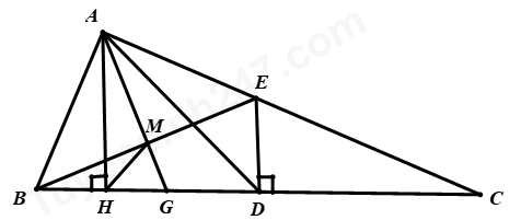 c) \(\left. \begin{array}{l}\angle BAM = \angle CAM \Rightarrow \dfrac{{GB}}{{GC}} = \dfrac{{AB}}{{AC}}\\\Delta CAH \sim \Delta CED(g.g) \Rightarrow \dfrac{{ED}}{{DC}} = \dfrac{{AH}}{{HC}} = \dfrac{{HD}}{{HC}}\\\Delta ABC \sim \Delta DEC(cmt) \Rightarrow \dfrac{{AB}}{{AC}} = \dfrac{{ED}}{{DC}}\end{array} \right\} \Rightarrow \dfrac{{GB}}{{GC}} = \dfrac{{HD}}{{HC}}\)