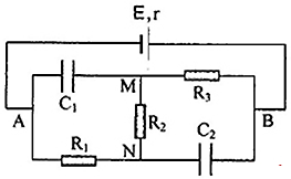 Biết \(E = 12V;r = 2\Omega ;{R_1} = 1\Omega ;\)\({R_2} = 2\Omega ;{R_3} = 3\Omega ;{C_1} = 1\mu F;{C_2} = 2\mu F\). Điện tích trên từng tụ điện là?