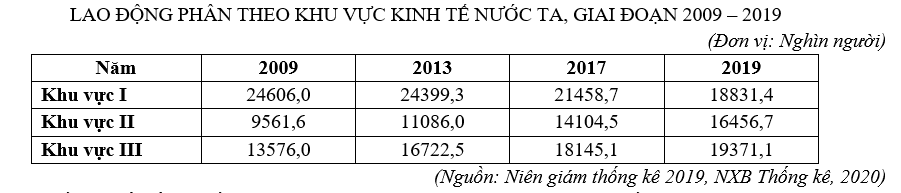 Theo bảng số liệu, để thể hiện tốc độ tăng trưởng lao động phân theo khu vực kinh tế nước ta giai đoạn 2009 - 2019, dạng biểu đồ nào sau đây là thích hợp nhất?