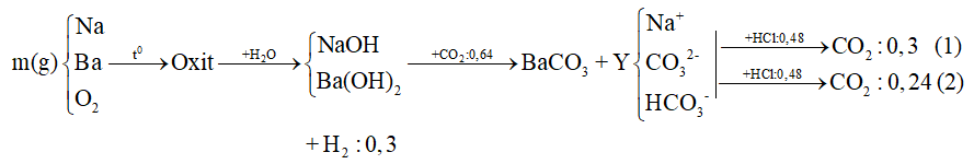 Hòa tan hết m gam hỗn hợp gồm Na, Na2O, Ba và BaO vào nước thu được 0,3 mol khí H2 và dung dịch X. Hấp thụ hoàn toàn 0,64 mol khí CO2 vào dung dịch X, thu được dung dịch Y chỉ chứa các muối và kết tủa Z. Chia dung dịch Y làm hai phần bằng nhau:
