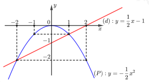 Cho hàm số \(y = - \dfrac{1}{2}{x^2}\) có đồ thị là \(\left( P \right)\) và hàm số \(y = \dfrac{1}{2}x - 1\) có đồ thị là \(\left( d \right)\).