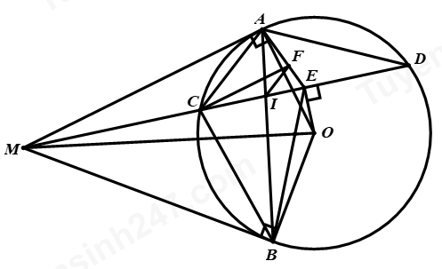 b) Vẽ cắt tuyến \(MCD\) không đi qua tâm \(O\) (\(MC < MD\), tia \(MD\) nằm giữa hai tia \(MA\) và \(MO\)), vẽ \(OE \bot CD\) tại \(E\). Chứng minh: \(M{A^2} = MC.MD\) và \(ME\) là phân giác của \(\angle AEB\).