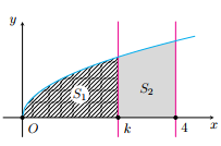 Cho hình thang cong (H) giới hạn bởi các đường \(y = \sqrt x \), y = 0, x = 0, x = 4. Đường thẳng x = k (0 < k < 4) chia (H) thành hai phần có diện tích là S1 và S2 như hình vẽ. Để S1 = 4S2 thì giá trị k thuộc khoảng nào sau đây?
