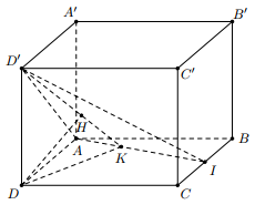 - Kẻ \(DK \bot AI\,\,\left( {K \in AI} \right)\), trong (DD’K) kẻ \(DH \bot D'K\) \(\left( {H \in D'K} \right)\), chứng minh \(DH \bot \left( {AID'} \right)\).