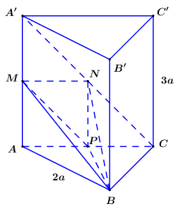 Cho lăng trụ đều ABC. A’B’C’ có AB = 2a, AA’ = 3a. Gọi M, N, P lần lượt là trung điểm của