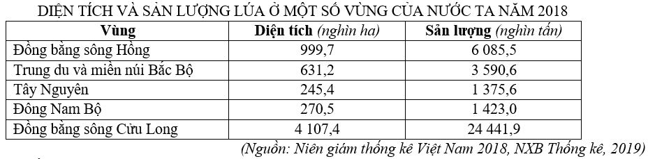Cho bảng số liệu:DIỆN TÍCH VÀ SẢN LƯỢNG LÚA Ở MỘT SỐ VÙNG CỦA NƯỚC TA NĂM 2018Theo bảng