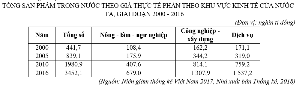 Cho bảng số liệu:Theo bảng số liệu, để thể hiện sự chuyển dịch cơ cấu tổng sản phẩm