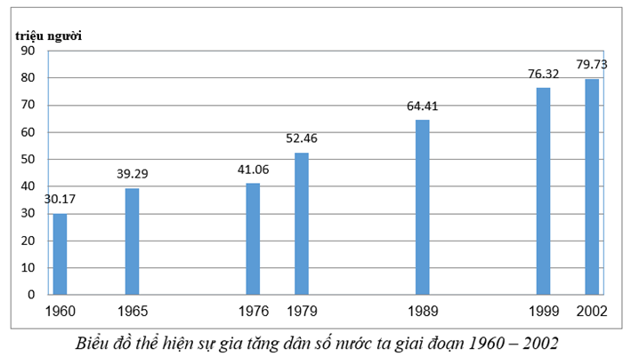 Quan sát biểu đồ sau: Trung bình dân số của nước ta từ năm 1960 đến năm 2002