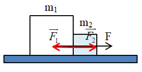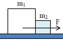 Hai vật đặt tiếp xúc với nhau trên mặt bàn không ma sát. Một lực ngang đặt vào vật \({m_1}\)