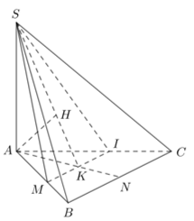 - Gọi N, K lần lượt là trung điểm của BC, MI, kẻ \(AH \bot SK\), chứng minh \(d\left( {A,\left( {SMI} \right)} \right) = AH\).