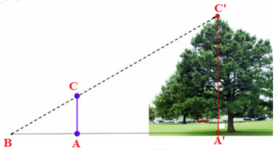 Hình dưới đây mô tả cách đo chiều cao của cây. Các thông số đo đạc được như sau: \(AB = \,1m\);\(AA' = \,4,5m;\)