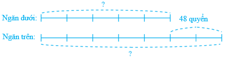 Ngăn trên có nhiều hơn ngăn dưới 48 quyển sách. Tìm số sách của mỗi ngăn biết rằng số sách