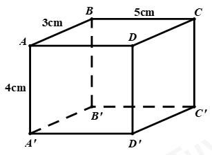 Hình hộp chữ nhật \(ABCD.A'B'C'D'\) có \(AB = 3cm,BC = 5cm;AA' = 4cm\) (hình vẽ). Khi đó thể tích của