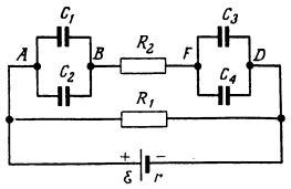 Xét mạch điện như hình vẽ, mạch ở trạng thái ổn định. Nguồn điện có \(\xi = 4V,r = 1\Omega \). Cho \({R_1} = 3\Omega ,{R_2} = 2\Omega ,{C_1} = 2\mu F,\)\({C_2} = 8\mu F,{C_3} = 4\mu F\) và \({C_4} = 6\mu F\). Năng lượng tích trữ trong các tụ điện \({C_1},{\mkern 1mu} {\mkern 1mu} {C_2},{\mkern 1mu} {\mkern 1mu} {C_3},{C_4}\) lần lượt là: