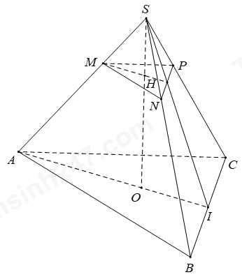 c) \(\dfrac{{{S_{\Delta MNP}}}}{{{S_{\Delta ABC}}}} = \dfrac{1}{9} \Rightarrow \dfrac{{{V_{S.MNP}}}}{{{V_{S.ABC}}}} = \dfrac{{\dfrac{1}{3}.{S_{\Delta MNP}}.SH}}{{\dfrac{1}{3}.S{ _{\Delta ABC}}.SO}} = \dfrac{1}{{27}}\)