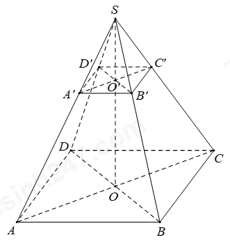 +\(\dfrac{{SA'}}{{SA}} = \dfrac{{SB'}}{{SB}} = \dfrac{{SC'}}{{SC}} = \dfrac{{SD'}}{{SD}} = \dfrac{{SO'}}{{SO}} = \dfrac{1}{3}\)và \(\dfrac{{V{ _{S.A'B'C'D'}}}}{{{V_{S.ABCS}}}} = \dfrac{{A'B{'^2}}}{{A{B^2}}} = \dfrac{1}{9}\)