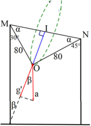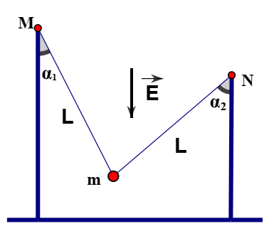 Vật nhỏ có khối lượng \(m = 200g\) tích điện \(q = 5\mu C\) được gắn với hai thanh cứng, rất nhẹ, cách điện có cùng chiều dài \(L = 80cm\). Đầu kia của mỗi thanh liên kết với hai bức tường thẳng đứng qua bản lề tại M và N. Biết \({\alpha _1} = {30^0},{\alpha _2} = {45^0}\). Hệ đặt trong điện trường đều có cường độ điện trường \(E = {4.10^5}V/m\) và \(\overrightarrow E \) cùng hướng với gia tốc trọng trường g. Vật ban đầu đứng yên. Lấy \(g = 10m/{s^2}\) và \(\pi = 3,14\). Kéo vật lệch khỏi mặt phẳng hình vẽ một đoạn nhỏ để vật dao động điều hòa. Chu kì dao động của vật gần giá trị nào nhất sau đây