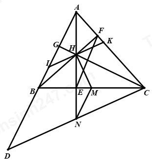 Cho \(\Delta ABC\) nhọn \((AB < AC)\). Các đường cao \(AE,BF\) cắt nhau tại \(H\). Gọi \(M\) trung điểm của \(BC\), qua \(H\) vẽ đường thẳng \(a\) vuông góc với \(HM\), \(a\) cắt \(AB,AC\) lần lượt tại \(I,K\).