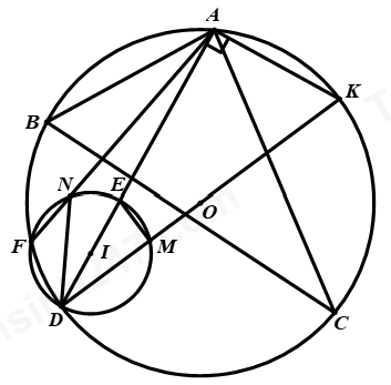 Cho tam giác \(ABC\) nhọn nội tiếp đường tròn \((O)\) \((AB < AC)\). \(D\) là điểm nằm trên cung nhỏ \(BC(D \ne B,DB < DC)\). Lấy điểm \(E\) thuộc đoạn thẳng \(AD\) sao cho \(AE > ED(E \ne D)\). Đường trờn đường kinh \(ED\) cắt đường tròn \((O)\) tại điểm \(F(F \ne D,F \ne B,F \ne C)\). Đường thẳng \(DO\) và \(AF\) cắt đường tròn đường kính \(ED\) lần lượt tại các điểm \(M,N(M \ne D,N \ne F)\). Kẻ đường kính \(DK\) của đường tròn \((O)\). Chứng minh: