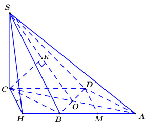 - Gọi M là trung điểm của AB, trong (ABCD) kẻ \(CH//DM\,\,\left( {H \in AB} \right)\). Xác định góc giữa (SAB) và (ABCD) là góc giữa hai đường thẳng lần lượt thuộc hai mặt phẳng và cùng vuông góc với giao tuyến).