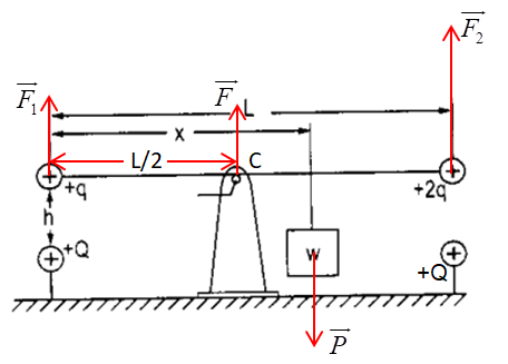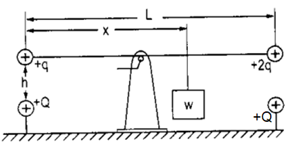 Một thanh dài L không dẫn điện, không trọng lượng có thể quay quanh trụ đi qua tâm của nó và được thăng bằng với một trọng lượng P đặt cách đầu trái của thanh một khoảng x (hình vẽ). Ở các đầu trái và phải của thanh được gắn hai quả cầu nhỏ dẫn điện có điện tích tương ứng bằng q và 2q. Ở ngay dưới mỗi quả cầu đó và cách một khoảng h có một quả cầu cố định với điện tích dương Q. Xác định h để thanh không tác dụng lực thẳng đứng lên giá đỡ khi thanh nằm ngang và thăng bằng.