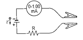 Một ôm kế đơn giản được chế tạo bằng cách mắc một pin 1,5V nối tiếp với một điện trở R và một ampe kế có thể đọc từ 0 đến 1,00mA (như hình vẽ). R được điều chính sao cho khi các đầu đo chập vào nhau thì ampe kế lệch hết thang ứng với 1,00mA. Nếu ampe kế có điện trở \(20,0\Omega \) và bỏ qua điện trở trong của pin thì gái trị của R bằng bao nhiêu?