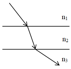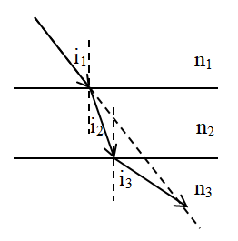 Một tia sáng đi qua mặt phân cách giữa 3 môi trường trong suốt như hình vẽ. Tốc độ của ánh sáng trong các môi trường