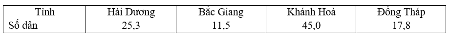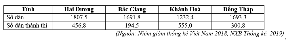 Cho bảng số liệu: SỐ DÂN VÀ SỐ DÂN THÀNH THỊ CỦA MỘT SỐ TỈNH NĂM 2018 (Đơn vị: Nghìn